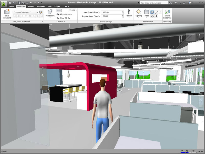 - tworzenie symulacji np. analizy budowy projektu w czasie z wykorzystaniem diagramów Gantta, wizualizacje, animacje obiektów, animacje typu przelotu kamery nad obiektem czy animacji z przemieszaniem się wirtualnej osoby widzianej z trzeciej perspektywy.