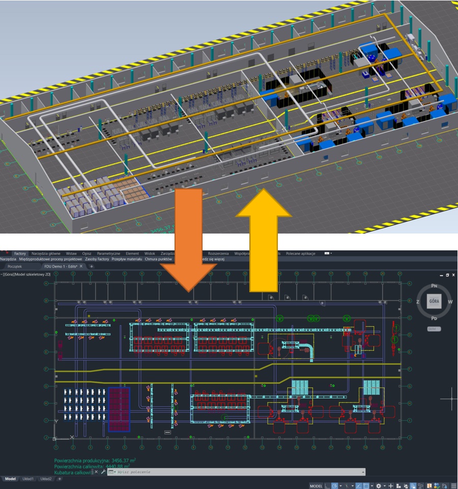 W ten sposób layout fabryki można tworzyć zgodnie z preferowaną metodą pracy, gdyż każda zmiana w środowisku 2D znajdzie swoje odzwierciedlenie w środowisku 3D i odwrotnie. Na tym etapie możliwe jest także wykrywanie kolizji w programie Inventor.